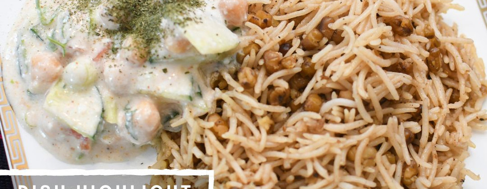 Sella rice cooked with Moong Dal (mung beans), onions, garlic, and Afghan spices. Served with Chat Salad — tomatoes, chickpeas, cucumber, red onions, fresh coriander leaves, mint, homemade yogurt, and chaat masala.