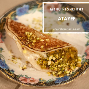 Atayef (also spelled Qatayef or Katayef) is a popular Middle Eastern dessert consisting of a small, yeasted pancake that is filled, shaped, and soaked in a fragrant, simple syrup. It is a staple sweet, especially popular during the Muslim holy month of Ramadan. Fadi’s atayef are filled with pistachios and a clotted cream called ashta (also spelled qishta, kashta, or eshta). The atayef are soaked in a rosewater, orange blossom syrup. Gluten-free: areesha with pistachios and rosewater, orange blossom syrup. Vegan: atayef filled with walnuts and cinnamon