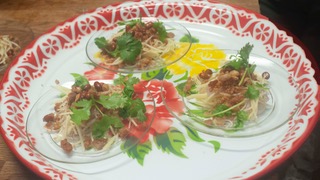 This amuse-bouche (mouth amuser) is an explosion of essential Thai flavors: sweet, salty, spice and sour. Lime, roasted peanuts, dried shrimp, shallots, roasted coconuts, bird eye chili, ginger, palm sugar fish sauce syrup served on a betel leaf. This small bite will open your palate for the rest of the meal. Gluten-Free. Vegan version available.